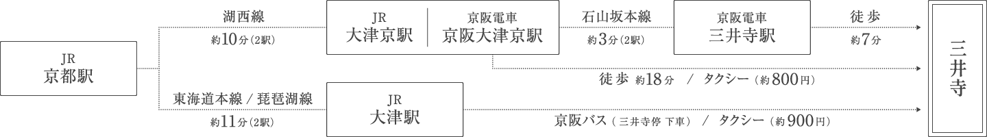 ○JR京都駅 → JR大津京駅(京阪 京阪大津京駅) → 京阪 三井寺駅下車、徒歩約7分