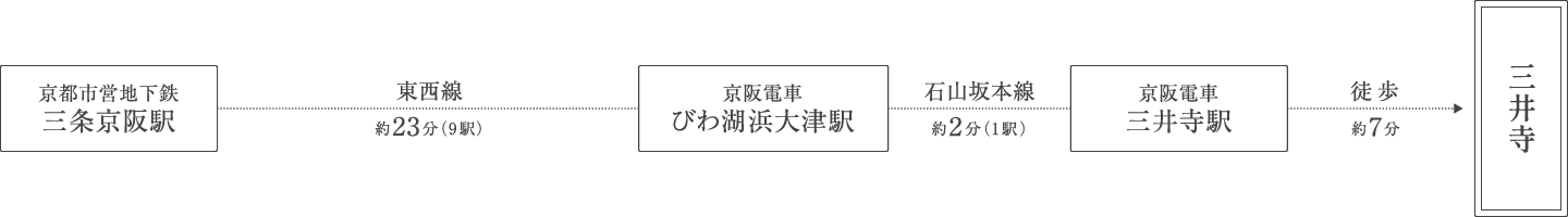○京都市営地下鉄 京阪三条駅 → 京阪 びわ湖浜大津駅 → 京阪 三井寺駅下車、徒歩約7分