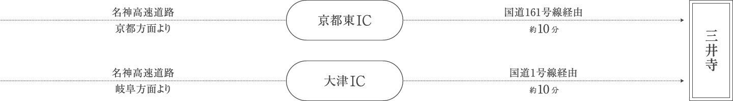 ○名神高速道路(岐阜方面) → 大津IC → 国道1号線経由で約10分