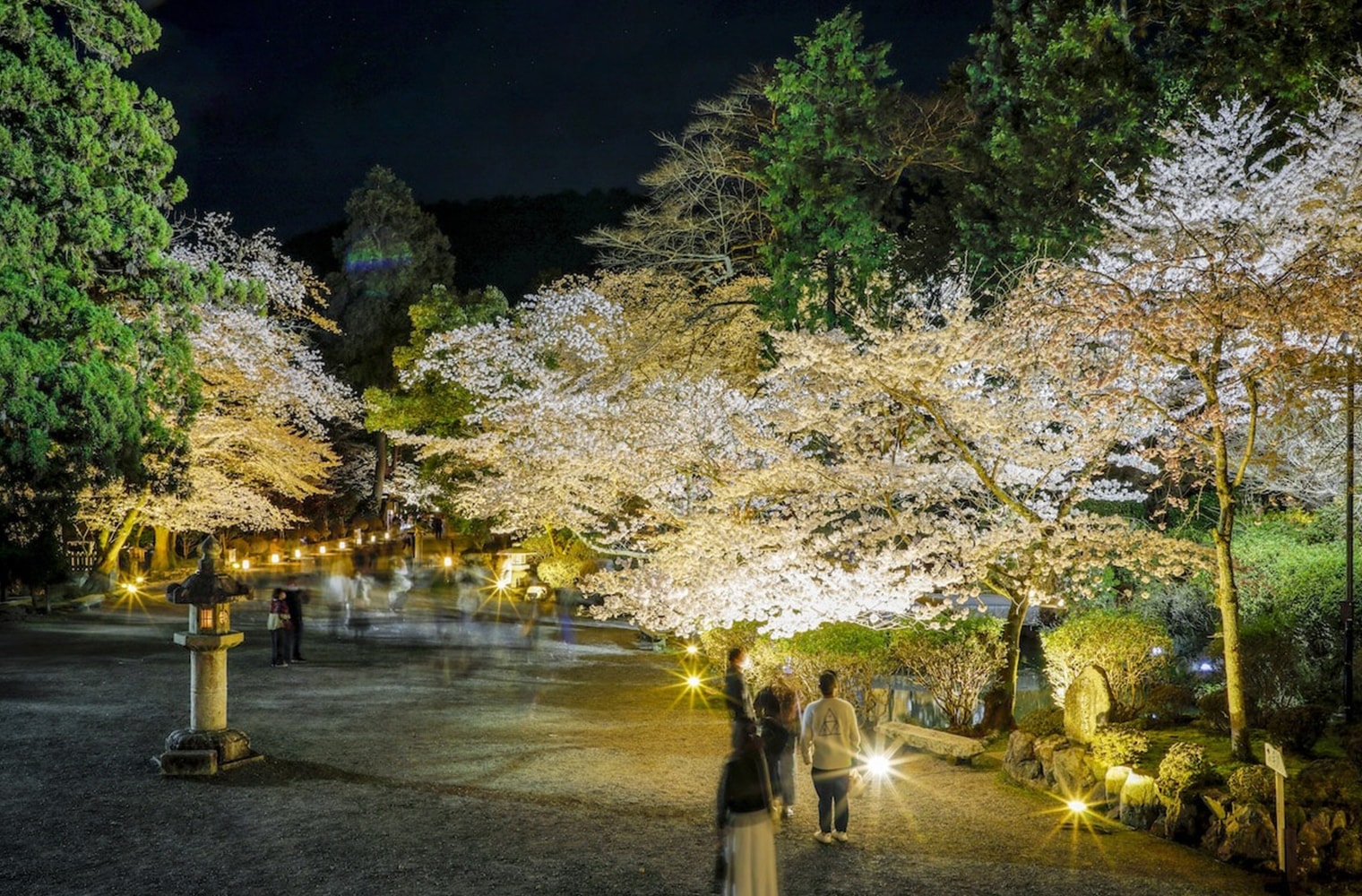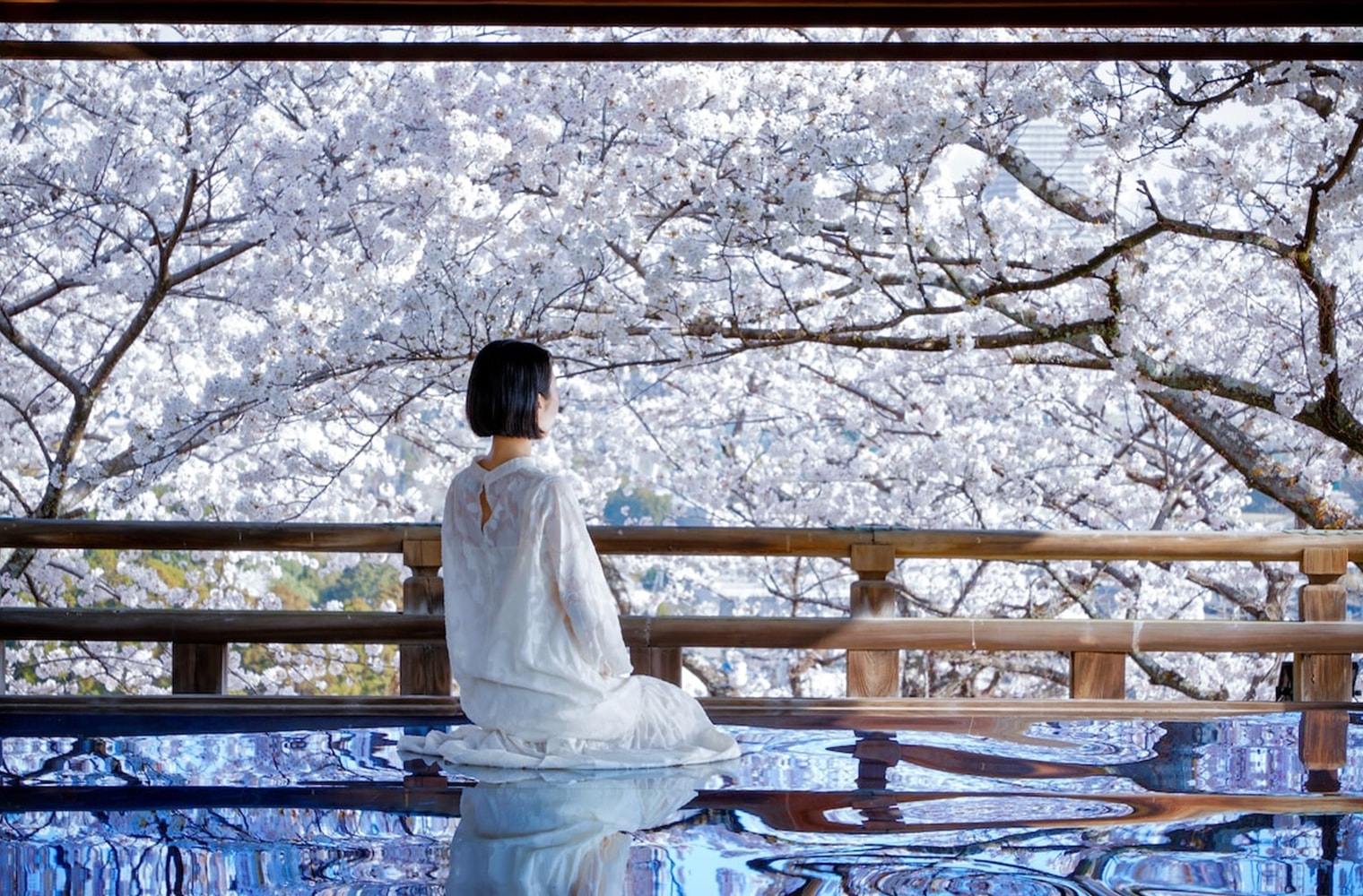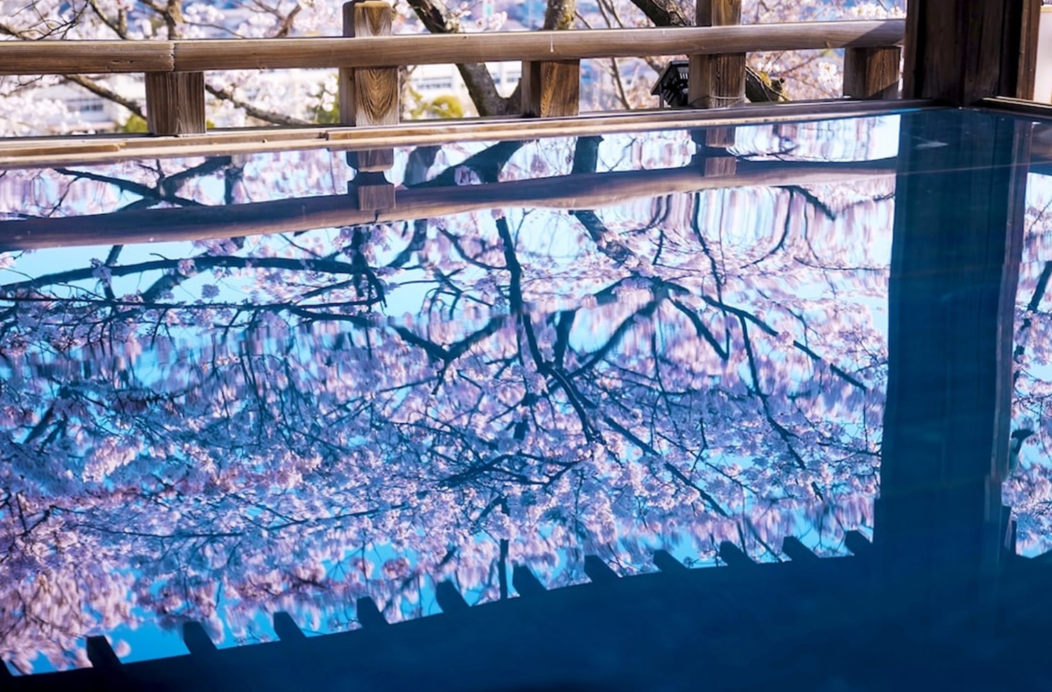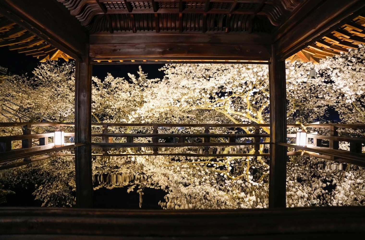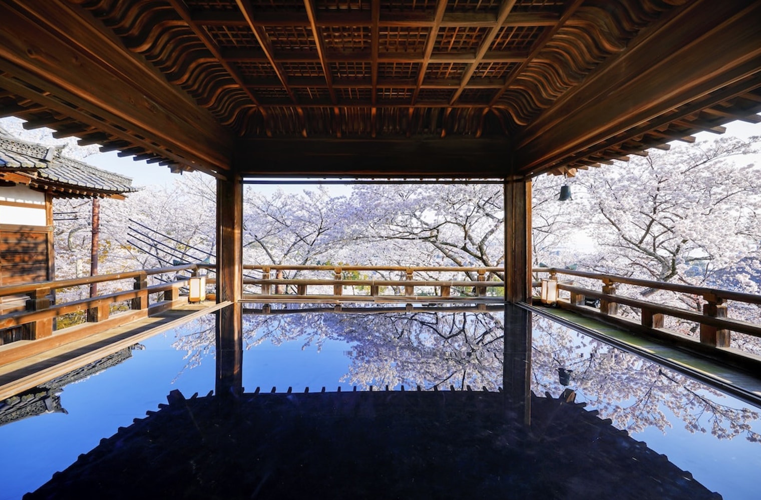 この時期だけ特別に入ることが許される観月舞台。鏡面に映し出された空と桜は、昼と夜で全く違った印象を与えます。この時期だけの特別な体験をぜひご堪能ください。