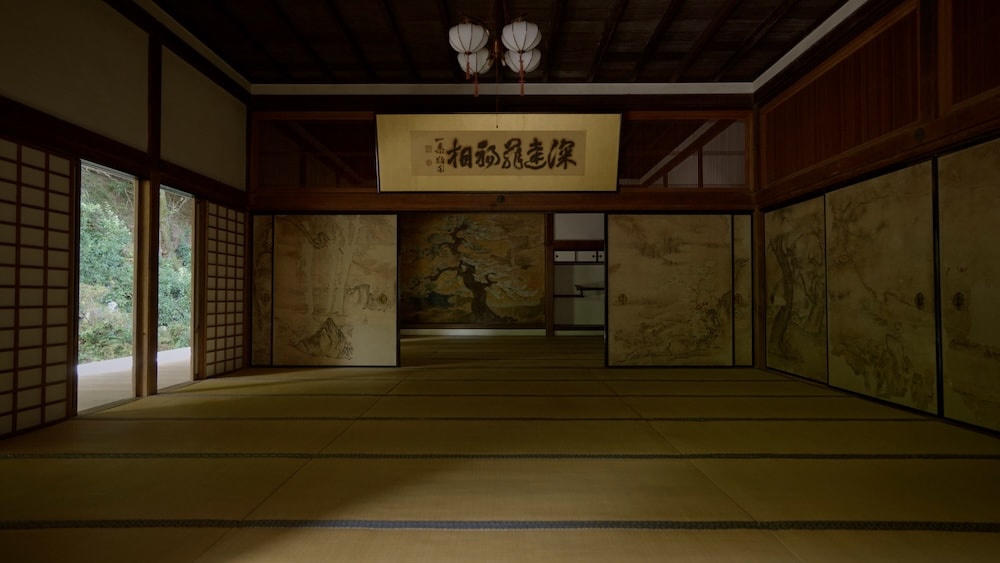 縁側越しの光が襖絵を照らし、池泉観賞式の庭は静かに広がります。