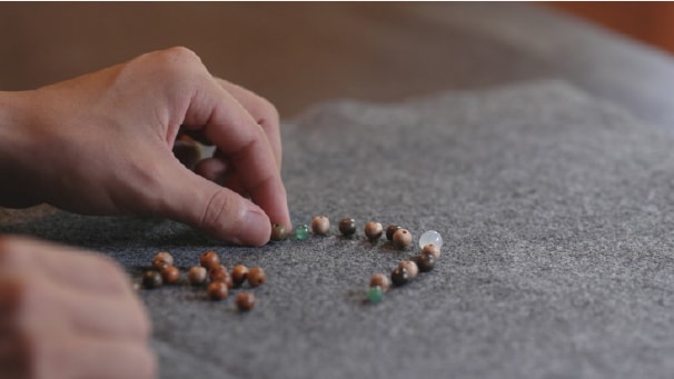 念珠(ビーズ)は、仏さまと心を結ぶ大切な法具です。この体験では、玉を選び願いを込めて結び、自分だけの念珠ブレスレットをつくります。